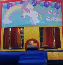 Made of lead free, fire retardant vinyl, this jumper is 14’4″ long x 13’4″ wide x 12’8″ high and perfect for kids 36″-70″. It also includes an access ramp and child safe mesh. It’s sure to delight your guests and provide hours of fun! Rent yours today for just $139! Please add a generator if your event is in a park.